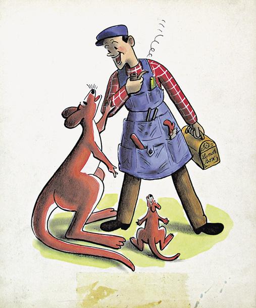 Скептики же в своих комментариях указывали на весьма интригующие нестыковки в параллелях между сумчатыми и Homo sapiens. «С карманом, полным кенгурят» [7] в той же азбуке показана самка, так с какой стати тогда природа дала мужским особям человеческого рода чуть ли не монополию на карманы? У галантного кавалера в костюме карманов было как сот в улье, а у его дамы — зачастую ни единого, справедливо отмечали критики. Абсурдность ситуации подчеркивалась в вышедшей в 1944 году детской книжке Эмми Пэйн «Кэти-бескарманница», где мама-кенгуру, разродившись кенгуренком, вдруг обнаруживает, что у нее — вопреки всем законам биологии — выводковая сумка отсутствует, и она пускается в долгое и трудное путешествие за тем, что ей «причитается» [8]. Вместе с едва ковыляющим на своих двоих сынишкой Фредди Кэти добирается до большого города и там встречает слесаря-спасителя, который «ВЕСЬ в карманах». Он, войдя в ее положение, жертвует Кэти свой фартук (рис. 2). Получив этот дар, мама получает возможность без проблем носить сына Фредди так, как и предполагалось природой [9].