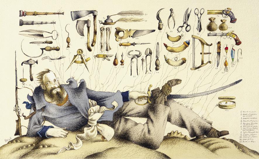 Рис. 3. Туллио Периколи. «Портрет Робинзона» (1984). Итальянский художник-иллюстратор изобразил Робинзона Крузо в окружении всех полезных вещей, что оказались при нем в итоге на необитаемом острове (включая дополнительные 12 позиций в описи справа). Ножницы, пилы, компас и ножи парят над ним ореолом, занимая ту же площадь, что и его собственная фигура.