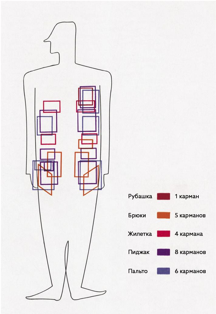 С тех самых пор, как без малого пятьсот лет тому назад карманы впервые оказались вшитыми в мужские брюки, портные и модельеры стали делать их в самых немыслимых местах, с особым усердием использовать их в мужских костюмах-тройках, где карманы можно обнаружить и на внутренней подкладке, и на фалдах фраков. На первой для Музея современного искусства в Нью-Йорке (MoMA; 1944) выставке о моде его куратор, архитектор Бернард Рудофски, создал специальную инсталляцию. Она наглядно демонстрировала распределение в середине XX века карманов по телу мужчины, число которых Рудовски явно считал избыточным. В каталог объекта он включил подборку рентгеновских снимков, позволяющих разглядеть всю подноготную и удостовериться, что карманы для мужской одежды бывают симметричными и несимметричными, разной формы и с разным выравниванием относительно друг друга (рис. 4). Из разноцветной схемы следует, что расположение карманов относительно торса меняется в зависимости от предмета одежды. Карманы тяготеют к бедрам и груди во всех предметах одежды и, похоже, на их расположение влияет факт того, кто будет носить одежду — правша или левша. В общей сложности в распоряжении у мужчины, одетого в брюки, рубашку, жилетку, пиджак и пальто, может оказаться до двадцати четырех карманов, «слой за слоем накладывающихся» друг на друга [11].