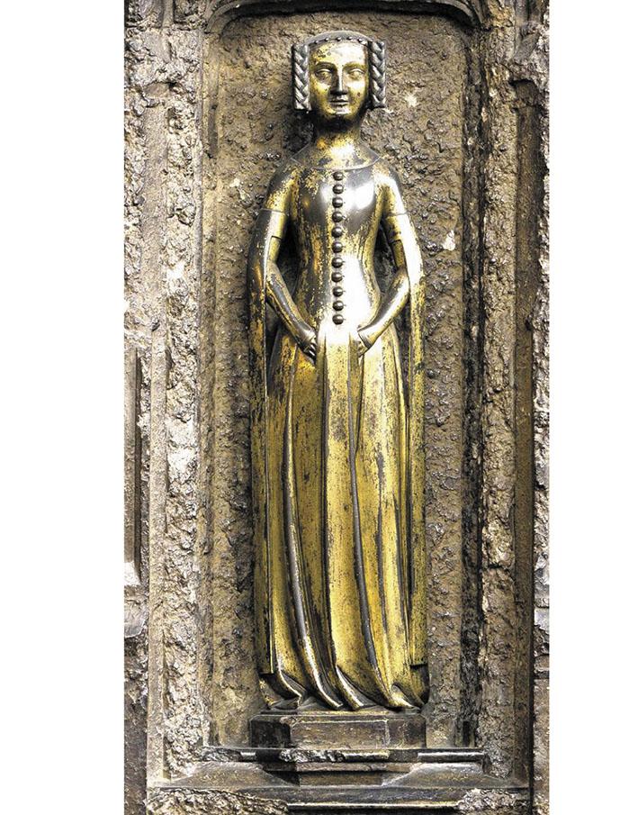 Рис. 8. Скульптурный портрет Иоанны Английской, дочери короля Эдуарда III, скорбно стоящей у гробницы отца, держа руки в узких прорезных карманах. Вестминстерское аббатство, 1377 год