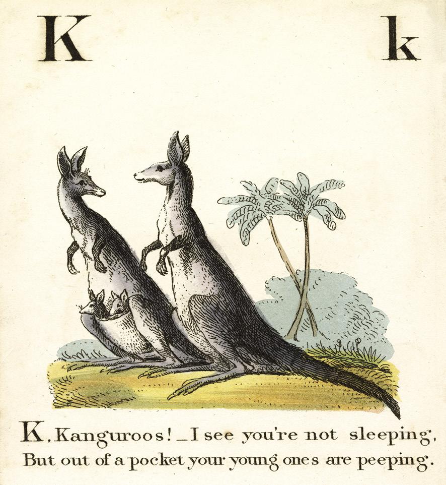 Рис. 1. Салли Скетч. «Животные по алфавиту для юных натуралистов» (1821): «К: Кенгуру, гляжу, не спят / С карманом, полным кенгурят!»