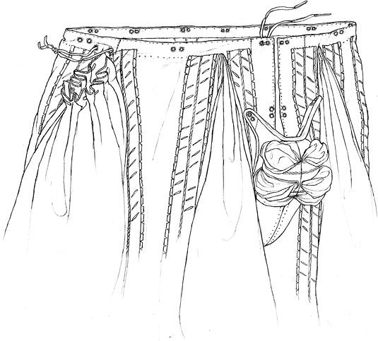 Рис. 12. Штаны Сванте Стуре, которые он носил в 1567 году. Зарисовка Джанет Арнольд. Единственный «карман-сумка» с затягивающимся шнурком пришит с правой стороны; по центру штанины соединены шнурованным гульфиком, выполняющим функцию современной ширинки. Кстати, бытует версия, что гульфик также являлся разновидностью кармана