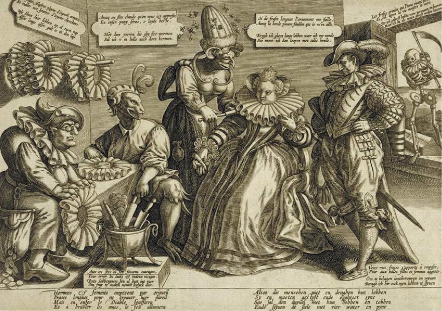По мере распространения карманов как незаменимого элемента мужской одежды, они еще и обретали более заметный облик, чему способствовало использование различных вариантов их отделки. На голландском сатирическом эстампе 1600 года кавалер, сопровождающий даму в ателье, одет в бриджи с большущим карманом, отделанным по краю прошивкой и шнуровкой, — его также дополнительно подчеркивает ряд из трех пуговиц (рис. 15). Часть женщин стали обзаводиться карманами в юбках платьев. Описи гардероба Елизаветы I указывают на то, что и у королевы в некоторых повседневных платьях и мантиях имелись карманы [73]. Однако они не были декоративными, и большинство женщин по-прежнему были склонны полагаться на кошели, подвешенные к поясу, подобно даме на рисунке 16, примеряющей новый турнюр.