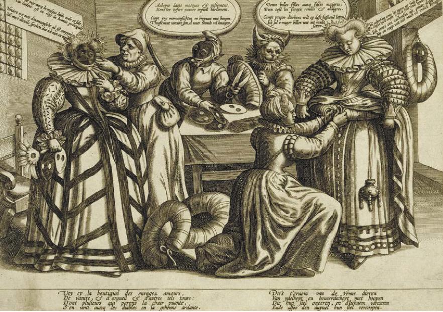 Рис. 16. Мартен де Вос (предположительно). «Женское тщеславие: маски и турнюры» (ок. 1600, фрагмент). Дама подняла свои юбки, чтобы портные могли примерить турнюр, обнажив свисающий на шнурке кошель — именно так женщины в Средние века носили свои кошельки
