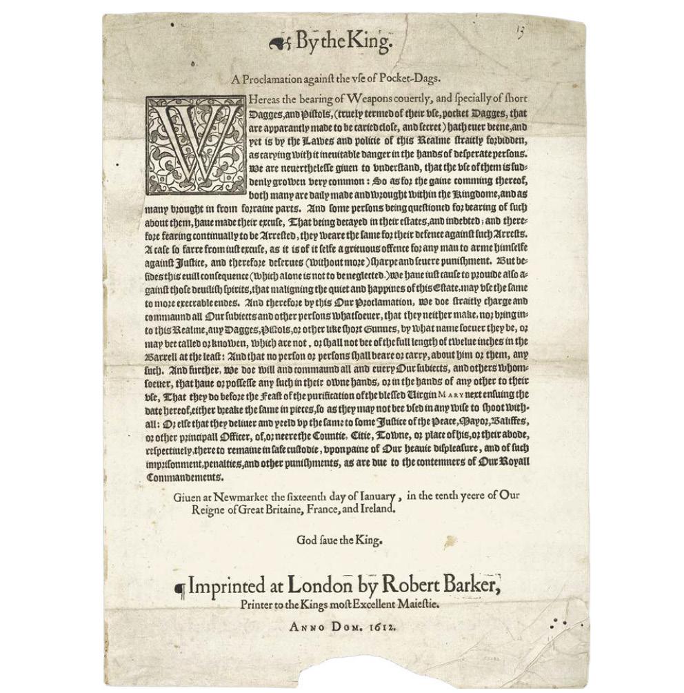 Рис. 18. «Прокламация против использования карманных пистолетов», выпущенная Яковом I в 1613 году. Согласно этому указу, лишь безрассудные люди носили карманные пистолеты (так называли пистолеты небольшого размера)