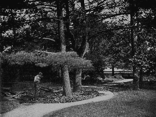 Following the walk down the lazy declivity, you take a turn with it beneath two aged pines, with the big lily-of-the-valley patch nestling in their shade; and (hard by) the well-appointed triangular flower plot, from time immemorial "bedded out" with "The Lady's" house plants. Turning on your track, you take a stroll through "The Lover's Walk"—a little, lilac-embowered pathway—and turning, follow, past the back of the house, the long, rocky ledge, with its glorious crown of white lilac trees—their tall tops touching the very ridge-pole of the roof.