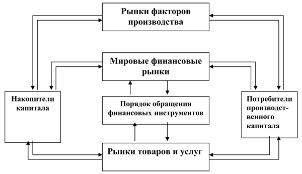 Мировой рынок капитала. Денежное обращение имеет непрерывную форму движения, которое происходит поступательно по нескольким воспроизводственным стадиям: изначально они концентрируются на стадии производства и товарообращения, откуда поступают в домашние хозяйства через выплаты заработной платы и получение предпринимательского дохода. Ввиду непрерывности процесса обращения периодическая смена стадий приводит к тому, что часть денежных средств постоянно выводится из оборота в виде накоплений домашних хозяйств и свободных финансовых ресурсов предприятий. Таким образом, и в домашних хозяйствах, и на предприятиях образуются финансовые средства за счет накопления ежегодных избытков денег, оставшихся после потребления, которые составляют основу для образования капитала на финансовом рынке. Этот капитал служит базой для запуска механизма финансового рынка, на котором происходит движение капитала от его владельцев к потребителям и наоборот, что определяет сущность мирового рынка капиталов как совокупности отношений по поводу аккумулирования свободных денежных средств и запуска их в обращение на финансовые рынки. По мере накопления свободного капитала до размеров, обеспечивающих выход на международные финансовые рынки, формируется предложение капитала для потребителей, которое реализуют держатели этого капитала, обеспечивая себе оптимальную норму прибыли.