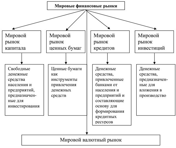 Движение капитала от накопителей к потребителям происходит по определенным стадиям, каждая из которых имеет свою систему отношений, обеспечивающую выполнение предназначенных для нее функций. На каждой стадии система отношений образует самостоятельный сегмент мирового финансового рынка, на базе которого образуются следующие последовательно взаимосвязанные подсистемы: рынок капиталов, рынок ценных бумаг, рынок кредитных ресурсов, рынок инвестиций. Отдельным сегментом выделяется валютный рынок, который находится в тесной взаимосвязи со всеми сегментами финансового рынка, так как обслуживает международные направления движения капитала на всех его стадиях.