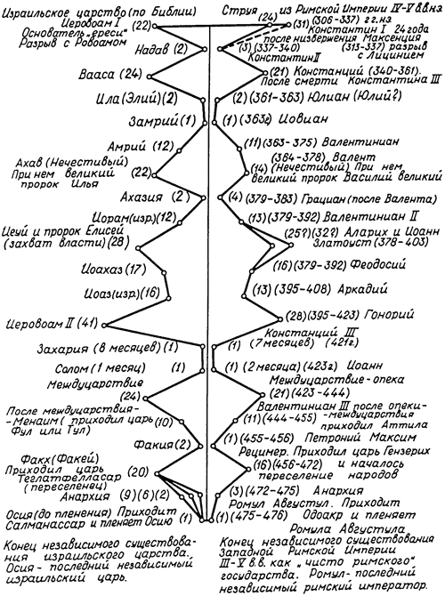 Рис. 0.3. Корреляция правлений «древнего» Израильского царства, по Библии, якобы от 922 до 724 гг. до н. э. и Третьей «античной» Римской империи якобы III–VI вв. н. э. На самом деле обе эти династии являются фантомными отражениями одной и той же реальной династии XIII–XVII вв.