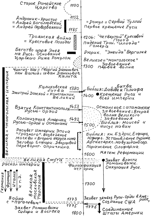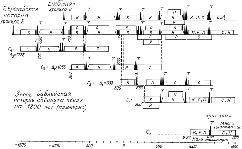Подведем итог этого этапа исследований. На основе перечисленных методов и статистических результатов А. Т. Фоменко выявил глобальную картину хронологических передатировок в версии Скалигера, после которых ошибки этой версии в основном устраняются. В частности, А. Т. Фоменко обнаружил три важных сдвига в хронологии: примерно на 333 года, 1053 года и 1800 лет. Эти сдвиги, конечно, присутствуют не в реальной, правильной хронологии, а лишь в ошибочной версии Скалигера – Петавиуса. Оказалось, что «скалигеровский учебник» склеен из четырех копий одной и той же короткой хроники. Этот основополагающий результат условно показан на рис. 0.4.