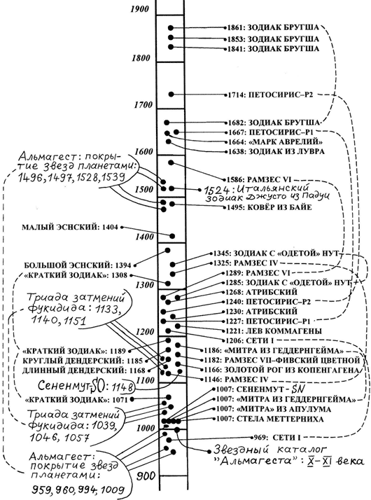 Далее мы выполнили астрономическое датирование многих «античных» записей астрономического характера, а именно описаний солнечных и лунных затмений, старинных звездных каталогов, гороскопов, – то есть описаний расположения планет по зодиакальным созвездиям, – покрытий звезд движущимися планетами и т. п. Оказалось, что во всех тех случаях, когда астрономические решения существуют, они попадают в эпоху X–XVII веков н. э.