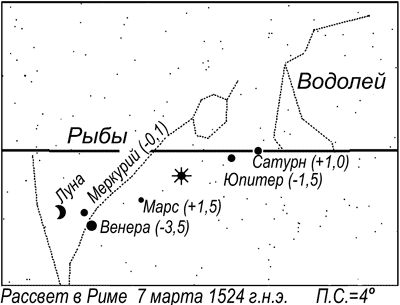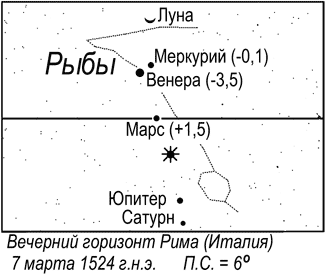 На закате 7 марта 1524 года Марс опускался под местный горизонт Рима, в Италии, в 17 часов 50 минут по Гринвичу при погружении Солнца на 6 градусов, рис. 1.7. Яркость Марса составляла в тот вечер + 1,5 по фотометрической шкале. Такой яркости было заведомо недостаточно, чтобы Марс мог быть виден невооруженным глазом при погружении Солнца на 6 градусов [НХЕ].