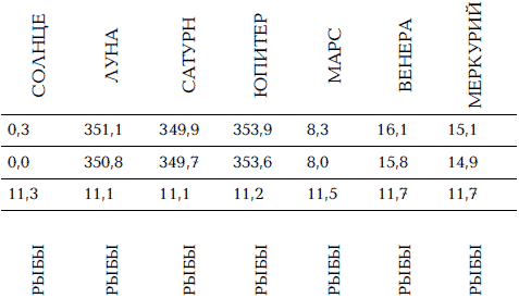 Приведем эклиптикальные долготы планет для всех перечисленных случаев. Долготы даны по эклиптике J2000. Точное время указано в юлианских днях. Как и выше, В ПЕРВОЙ СТРОКЕ цифр мы даем эклиптикальную долготу планет в градусах, ВО ВТОРОЙ – отклонение планет от Солнца по долготе в градусах по эклиптике J2000, В ТРЕТЬЕЙ – положение планет по шкале созвездий, см. раздел 5.10 в [НХЕ].