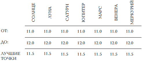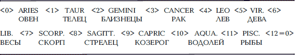 В таблице приведены допустимые положения планет на эклиптике (ОТ… ДО) и «ЛУЧШИЕ ТОЧКИ». Последние служат для задания взаимного порядка планет, а также для расчета их среднего отклонения в решении от заданных положений. В данном случае все «лучшие точки» взяты одинаковыми – середина созвездия Рыб. При этом использована следующая циклическая неравномерная «шкала созвездий» на эклиптике – соответствующая ЗОДИАКАЛЬНЫМ СОЗВЕЗДИЯМ, а не «зодиакальным знакам» с теми же названиями, которые используются в современной астрологии, но имеют к созвездиям весьма отдаленное отношение – см. подробности в [НХЕ]:
