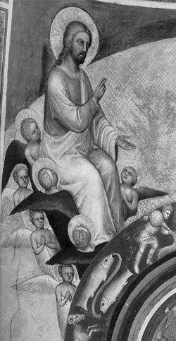 Рис. 1.2. Христос в виде Бога Отца, восседающего на херувимах и окруженного серафимами. Херувимы и серафимы нарисованы в виде мальчиков с крыльями. Данная фреска имеет также и астрономический смысл: изображено, как все семь планет древности (обозначенные в виде мальчиков – херувимов и серафимов) сошлись в Рыбах. Взято из [86], с. 410, илл. 244