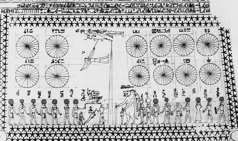 Рис. 1.9. Фрагмент потолка гробницы Сенмута (Сененмута). Датировка историков – около 1500 г. до н. э. Но здесь изображен гороскоп с датой: 17–18 июня 1148 года НАШЕЙ ЭРЫ. Взято из [17], илл. 4