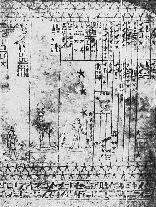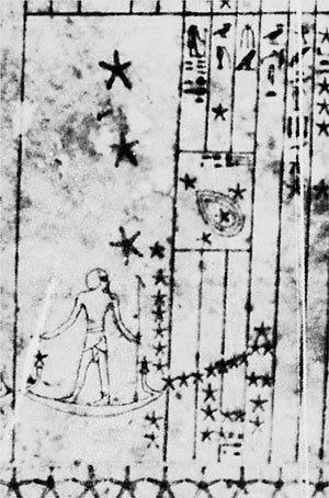 Рис. 1.10. Зодиак «SO» из гробницы Сенмута (Сененмута). Фрагмент потолка. Здесь изображено схождение всех семи планет возле точки летнего солнцестояния в Близнецах. Подобный символ мужчины с посохом, стоящего в лодке, часто встречается на египетских зодиаках и всегда обозначает точку летнего солнцестояния в Близнецах. Три крупные звездочки – это три видимые на небе планеты (остальные невидимы из-за близости к Солнцу). Перед нами – астрономическое описание даты: 17–18 июня 1148 года НАШЕЙ ЭРЫ. Взято из [17], илл. 4