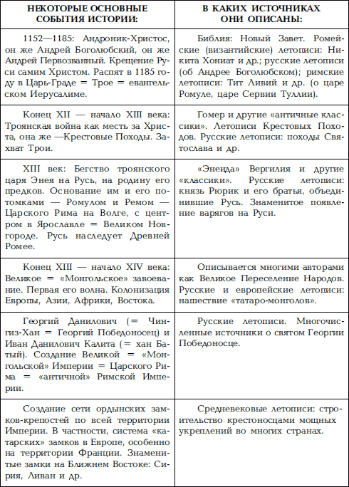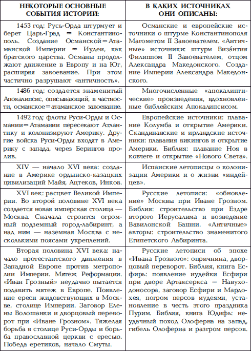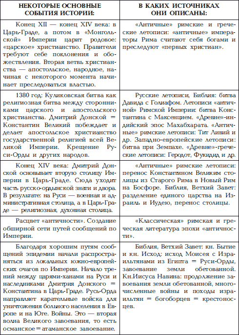 Что мы имеем в виду, сообщая о новых сведениях, открытых нами и значительно расширяющих наши познания о многих знаменитых людях и событиях древнего мира? Речь вовсе не идет об обнаружении нами каких-либо принципиально новых, никому ранее не известных рукописей или надписей. Извлеченных, скажем, из каких-то пыльных, забытых архивов или в результате раскопок. В основном мы работаем с хорошо известными старинными текстами. Хотя иногда нам действительно удавалось разыскать самим или при помощи коллег исключительно редкие и уникальные исторические материалы, оказывавшиеся очень ценными для новой хронологии. Но все-таки основное внимание мы уделяем известным «античным» произведениям, Библии, многочисленным средневековым летописям и рукописям. Наше открытие – бывшее, кстати, довольно неожиданным для нас самих, – состоит в том, что эти в общем-то известные тексты таят в себе, оказывается, очень много непознанного, прочно забытого, «закопанного» редакторами XVI–XVIII веков. И эти глубоко погребенные сведения нужно «раскапывать». Иногда с большим трудом. Будучи извлечены на свет, они оказываются обломками когда-то богатой и детальной картины прошлого, забытыми фрагментами жизнеописаний известных героев. Очищая обломки от грязи и позднейших наслоений, мы освещаем ярким светом многие полузабытые или вовсе забытые факты прошлого. Авторы не касаются вопросов веры и богословия и не обсуждают ни одного из церковных догматов. В книге затрагиваются исключительно вопросы историкохронологического характера.
