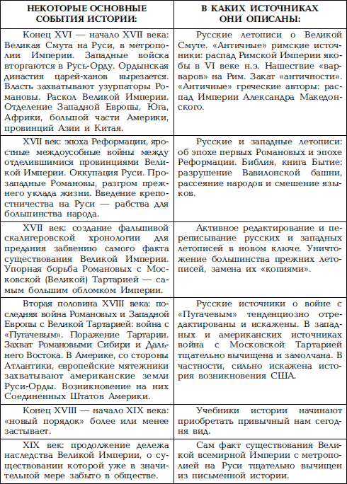 Иными словами, после возвращения на правильное хронологическое место древних летописей обнаружилось, что «учебник древней истории» радикально укорачивается, сокращается. Все известные на сегодня старинные документы описывают в общем-то подлинные события древности, однако события эти произошли в эпоху XI–XVII веков. Становится ясно, что никаких «темных веков» не было. Они появились лишь благодаря неверной скалигеровской хронологии, отбросившей в далекое прошлое многие события Средних веков. В результате в «античности» замерцали призрачные фантомы эпохи XI–XVII веков, а многие периоды Средневековья, напротив, искусственно оголились. И были впоследствии названы «темными веками». С точки зрения новой хронологии получается, что никаких зияющих провалов в развитии цивилизации не было. Развитие было, как и сегодня, весьма динамичным и сравнительно быстрым, по восходящей линии, без глобальных катастроф.