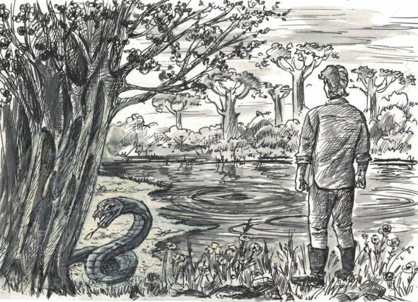 — «Откуда такая рептилия?!» — вскочил он, раскрыв от удивления глаза. В его представлениях о животном мире её можно было сравнить разве что с огромной анакондой.