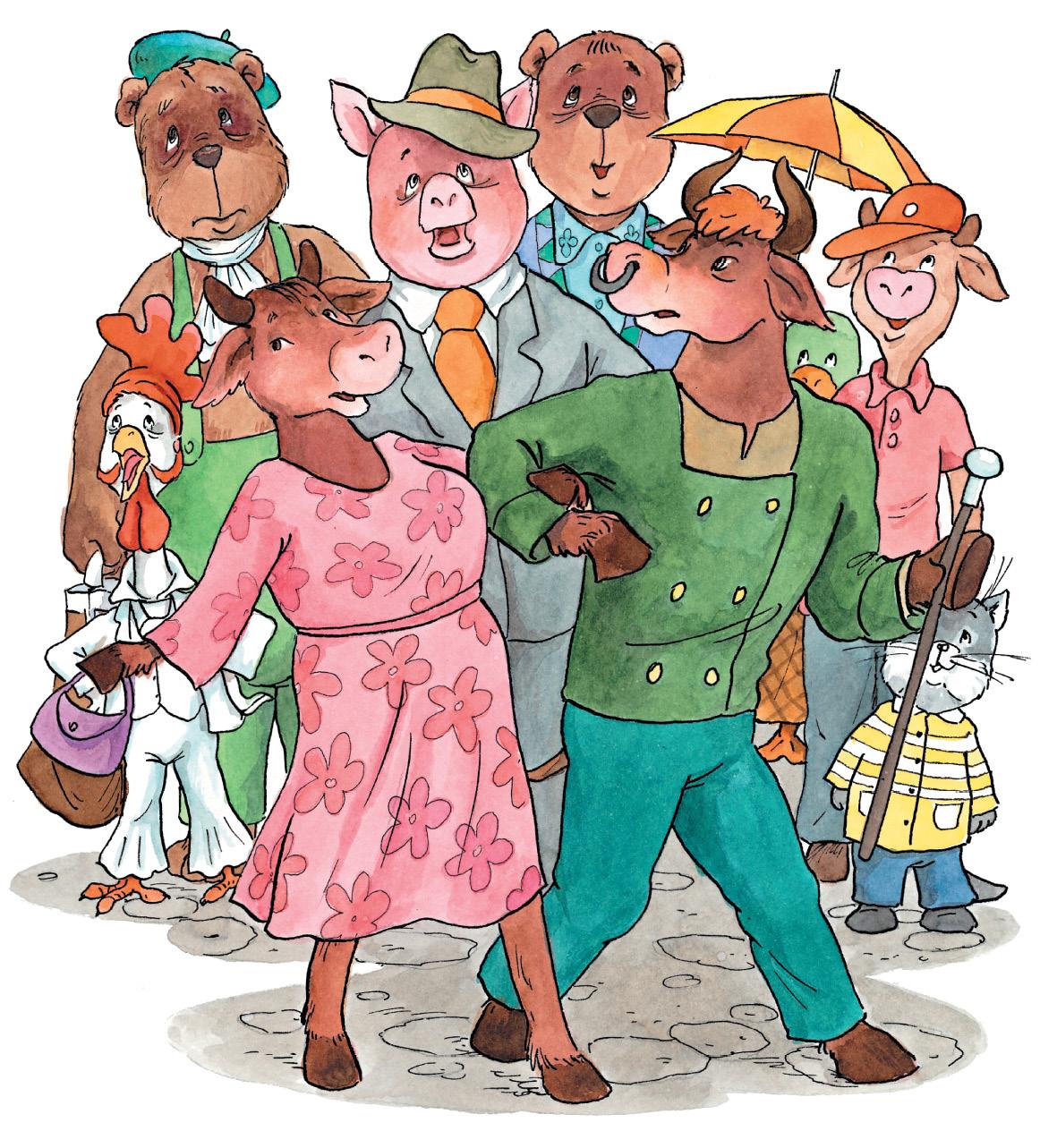 Это сказал славный рифмоплёт города Небось господин Нильссон – бык, который разговаривает в рифму, то бишь стихами. Но на этот раз он почему-то возмущён. Он топает копытами по тротуару и тянет за собой свою жену Оливию: они как раз совершали воскресную прогулку. Гляньте, как он размахивает тростью!