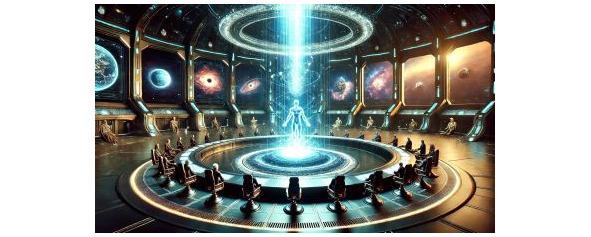 В центре Межгалактического Совета появился луч, из него материализовалась плазменная фигура Некоего существа. Он присоединился к Совету, сев в кресло, которое появилось перед ним.