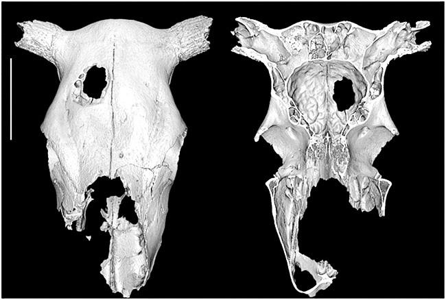 Рис. 2. Череп коровы с отверстием в правой лобной кости.