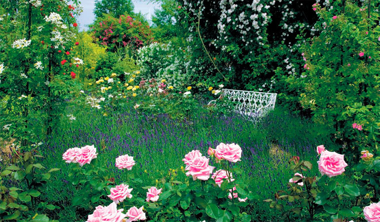В розовом царстве ничто не будет отвлекать человека от любования королевой цветов. Конечно, не обойдется без других растений, листопадных или вечнозеленых, но они будут выполнять функции либо фона, либо дополнения. Такой сад будет состоять из цветников правильной формы, рабаток и бордюров. Не помешают и дополнительные акценты в оформлении: малые архитектурные формы, вазоны, скульптуры, фонтаны. В качестве окантовки цветников можно использовать невысокую стриженую живую изгородь, для которой важно подобрать растения, соответствующие вашим климатическим условиям. Можно также окантовать цветники бордюром из брусчатки либо других материалов. Для покрытия дорожек между розариями стоит применять мелкий щебень, декоративную щепу, гальку, мраморную крошку и т. д.