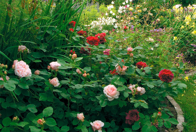 Итак, чем же хороши смешанные посадки? Сочетание кустарников, травянистых многолетников и луковичных дает стабильный декоративный эффект на протяжении всего дачного сезона. Мало того, грамотный подбор растений позволяет обеспечить в саду практически непрерывное цветение. А розы, несмотря на существующее у некоторых людей предубеждение, прекрасно сочетаются со многими растениями. Одни из них могут стать весьма удачным фоном для роз, другие поддержат декоративность цветника в весеннее и осеннее время, а также в паузах между волнами цветения роз, третьи позволят сделать композицию более совершенной и живописной.