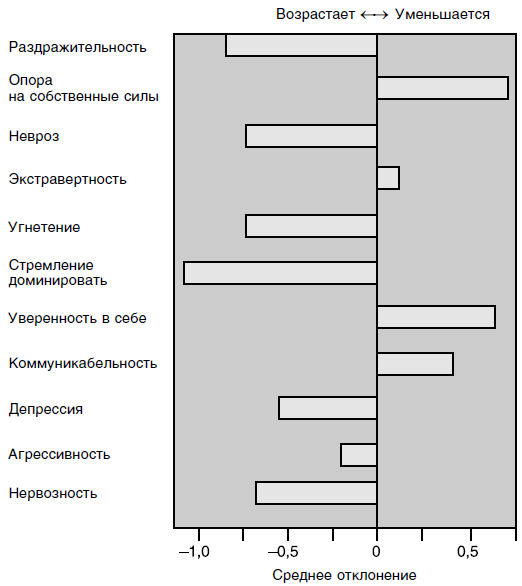 При сравнительном исследовании 49 человек, практикующих медитацию, и контрольной группы из людей, соответствующих по полу и возрасту, западногерманские исследователи обнаружили значительные личностные различия. (На приведенной ниже диаграмме показано, как у практикующих медитацию усиливаются позитивные качества и уменьшаются негативные. У тех, кто не практикует медитацию, особых изменений не отмечено.)