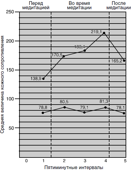 На этом графике, взятом из британского исследования 1973 года, видно, какое мощное воздействие трансцендентальная медитация (ТМ) оказывает на кожное сопротивление – тот самый показатель, который измеряется при тестировании на детекторе лжи для определения уровня тревожности или релаксации организма. Как можно видеть, кожное сопротивление значительно возрастает (а это показатель глубокого расслабления) у тех, кто практикует ТМ. Для сравнения участники контрольной группы демонстрируют относительно небольшие колебания кожного сопротивления.