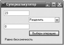 Элемент управления ComboBox служит для отображения вариантов выбора в раскрывающемся списке. Продемонстрируем работу этого элемента управления на примере программы, реализующей функции калькулятора. Здесь для отображения вариантов выбора арифметических операций используется комбинированный список ComboBox.