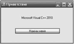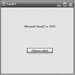 Ваша первая программа будет отображать такую экранную форму, в которой будет что-либо написано, например «Microsoft Visual C++ 2010», также в форме будет расположена командная кнопка с надписью «Нажми меня». При нажатии кнопки будет появляться диалоговое окно с сообщением «Всем привет!»