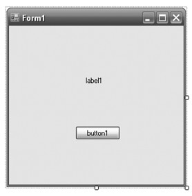 Теперь давайте добавим в форму названные элементы управления. Для этого нам понадобится панель элементов управления Toolbox. Если в данный момент вы не видите панель элементов, то ее можно добавить, например, с помощью комбинации клавиш Ctrl+Alt+x или View\Toolbox. Итак, добавьте метку Label и кнопку Button в форму, дважды щелкая на этих элементах на панели Toolbox. А затем следует расположить их примерно так, как показано на рис. 1.3.