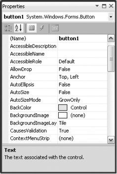 Любой такой объект можно создавать самому, а можно воспользоваться готовыми объектами. В данной задаче мы пользуемся готовыми визуальными объектами, которые можно перетаскивать с помощью мыши из панели элементов управления Toolbox. В этой задаче нам следует помнить, что каждый объект имеет свойства (properties). Например, свойствами кнопки являются (рис. 1.4): имя кнопки (Name) — button1, надпись на кнопке (Text), расположение кнопки (Location) в системе координат формы X, Y, размер кнопки Size и т.д. Свойств много, их можно увидеть, если щелкнуть правой кнопкой мыши в пределах формы и выбрать в контекстном меню команду Properties, при этом появится панель свойств Properties (рис. 1.4).