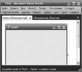 Чтобы запрограммировать какую-либо задачу, необходимо в пункте меню File выполнить команду New Project. В появившемся окне New Project в левой колонке находится список установленных шаблонов (Installed Templates). Среди них — шаблоны языков программирования, встроенных в Visual Studio, в том числе Visual Basic, Visual C#, Visual C++, Visual F# и др. Нам нужен язык Visual C++. В узле Visual C++ области типов проектов выберем среду CLR, а затем в области шаблонов (в средней колонке) выберем шаблон (Templates) Windows Forms Application Visual C++. Теперь введем имя проекта (Name) First и щелкнем на кнопке OK, в результате увидим окно, представленное на рис. 1.2.
