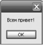 Здесь вызывается метод (программа) Show объекта MessageBox с текстом «Всем привет!» Оператор разрешения области действия (::) указывает системе найти метод Show среди методов объекта Messagebox. Таким образом, я здесь «нечаянно» проговорился о том, что объекты кроме свойств имеют также и методы, то есть программы, которые обрабатывают объекты. Кстати, после каждого оператора в C-программах ставят точку с запятой. Это вместе с фигурными скобками по форме отличает C-программу от программных кодов на других языках программирования.