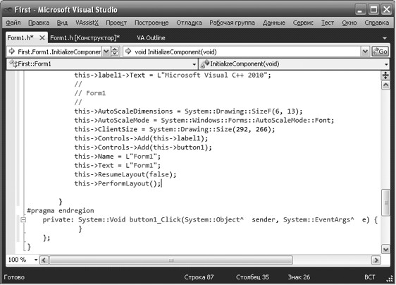 На вкладке Form1.h мы увидим, что управляющая среда Visual C++ 2010 сгенерировала довольно-таки много строк программного кода. Не стоит ужасаться такому обилию непонятного кода, постепенно многое прояснится. Во всяком случае, в этом тексте вы уже можете найти те присваивания, которые сделали в панели свойств Properties. Например, для свойства Text кнопки Button управляющая среда назначила строку «Нажми меня»: