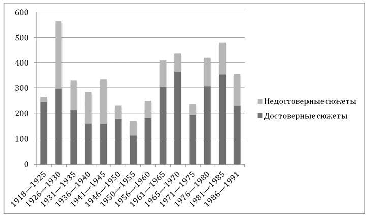 Проанализировав каждый из выделенных сюжетов, мы по самой ранней фиксации или по датировке, выставленной автором источника, сумели выявить приблизительное время появления или актуализации для 4755 сюжетов. Для удобства представления данных о хронологии развития сюжетного фонда мы распределили сюжеты на 14 отрезков примерно по пять лет. Эти хронологически периоды не равны — мы вынуждены были использовать в качестве «пятилеток» бóльшие временные отрезки (1918—1925 и 1985—1991 года). Условность этого деления может быть оправдана общим уровнем условности хронологической локализации значительной части материала, точность датировки которого колеблется от одного дня до промежутка в несколько лет, что не позволяет использовать более конкретную шкалу. Картина хронологического развития сюжетного фонда получилась такой (см. график).