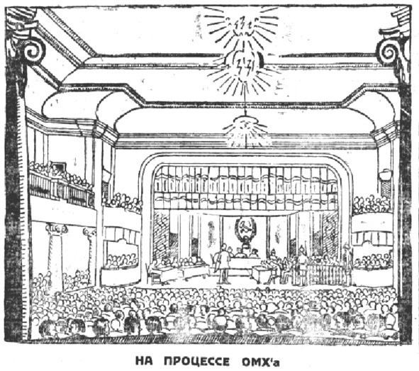 Пресса и власти, не стеснявшиеся на протяжении двух месяцев в выражениях при изложении состава преступления и не жалевшие красок для описания царившего в ОМХе разврата, превратили заседания в спектакль: «В глубине сцены – стол суда. По бокам – столы защиты и обвинения. Позади стола защиты – тридцать два стула для подсудимых»29. Однако, к началу процесса уже несколько перегнули палку: «…часть публики, выражающая настроение обывательской стихии, окружает процесс атмосферой нездорового любопытства и размусоливания так называемых пикантных подробностей, норовя снизить большое и волнующее содержание дела до степени малюсенького анекдота, поданного со скабрезной приправой. Короче говоря, общественная и политическая сущность процесса подменяется похабной сущностью некоторых деталей»30.