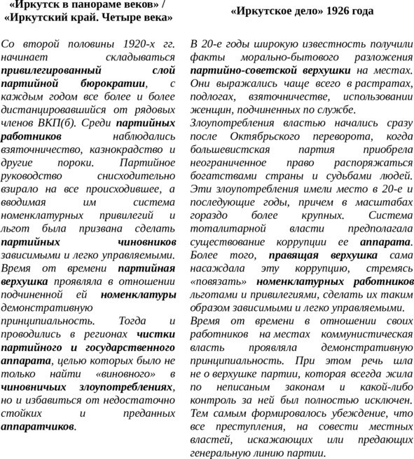 Сюда же относились классические, как для дореволюционного, так и для постсоветского периода, нарушения – закупки услуг и товаров по завышенным ценам и обход конкурсных процедур: «…сделка на проволоку с гр. Сапожниковым была совершена по ценам, вдвое более высоким, нежели у госорганизаций. Покупаются у частников кожаные рукавицы по цене от 1 р. 60 к. до 2 руб. за пару, и то время как в Сибторге они стоили 1 р. 05 к. пара […] Переплачивалось не только против цен госорганов и кооперации, но и против цен, существовавших у частников; так, бабит на иркутском частном рынке стоил 12 р. пуд, лестрест платит 18 р. 50 к. пуд; канат – 16 р. пуд, лестрест платит 18 руб. […] То же самое при сдаче различных работ. Государственные механические мастерские политехникума получают вдвое меньше заказов, нежели частная мастерская „Литейщик“. Часть этих заказов „Литейщик“ передает на изготовление в государственные мастерские, так как у него не было соответствующего оборудования […] Как известно, сделки на сумму свыше 500 руб. подлежат обязательной регистрации на товарной бирже. Для того, чтобы обойти это законоположение, сделка с Сапожниковым на проволоку в сумме 4500 руб. разбивается на 16 отдельных счетов, при чем вся проволока принимается на склад сразу»34. Правда, нужно отметить, что все эти факты не трактовались, как свидетельство «откатов» и «распилов», а были квалифицированы просто как бесхозяйственность. Несмотря на то, что, например, «рабочие деревообделочники знали, что не на свои деньги Борейша (арестованный сейчас зам. управляющего Лесотреста) купил себе дом и завел мотор»35, тот же Борейша, получивший 2 года заключения, вообще был полностью оправдан после рассмотрения кассационной жалобы в Верховном суде.
