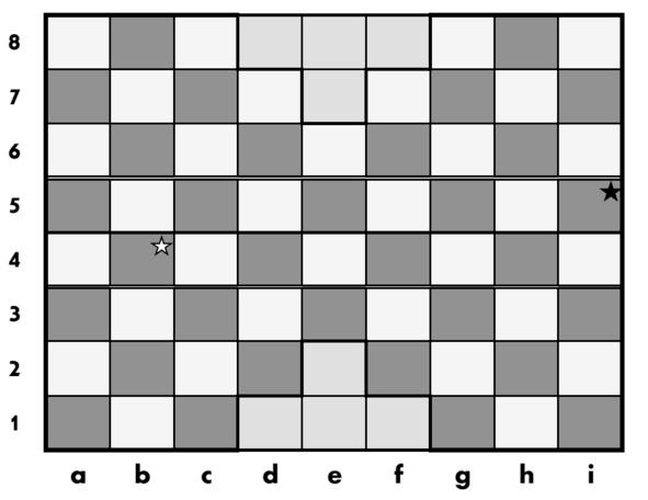 Для того, чтобы выделить среди остальных полей клетку игрового поля, которая оказалась выбранной в качестве неприступного поля, она отмечается какой-либо меткой. В настоящей книге неприступное поле отмечается небольшой звездочкой: белой звездочкой обозначается неприступное поле белых, черной (темной) звездочкой отмечается неприступное поле черных. На рис. 1.1 показано, что неприступными полями являются: неприступное поле белых — b4 (отмечено белой звездочкой), неприступное поле черных — i5 (отмечено черной звездочкой).