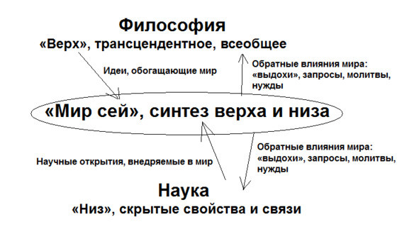 Стрелки от середины представляют собой «выдох», а обратное влияние – «вдох». Философский вдох формирует мир идей, а вдох от науки – мир вещей. В идеале выдох вверх определен потребностями души (духа), а выдох книзу – потребностями тела. От преобладания философского, или научного подхода к окружающему зависит и тип культуры. Там, где в основном сознание определяет бытие – в традиционных холодных культурах, важна роль сакрального начала, а материальный прогресс почти отсутствует. При схеме «бытие определяет сознание» на первый план выходит наука, материя, происходит дегуманизация не только отношения к бытию (деантропоморфизация), но и к человеку (историзм). Это свойственно «горячим» культурам, для которых миф заменяется историей, а философия подчинена науке (сциентизм, позитивизм).