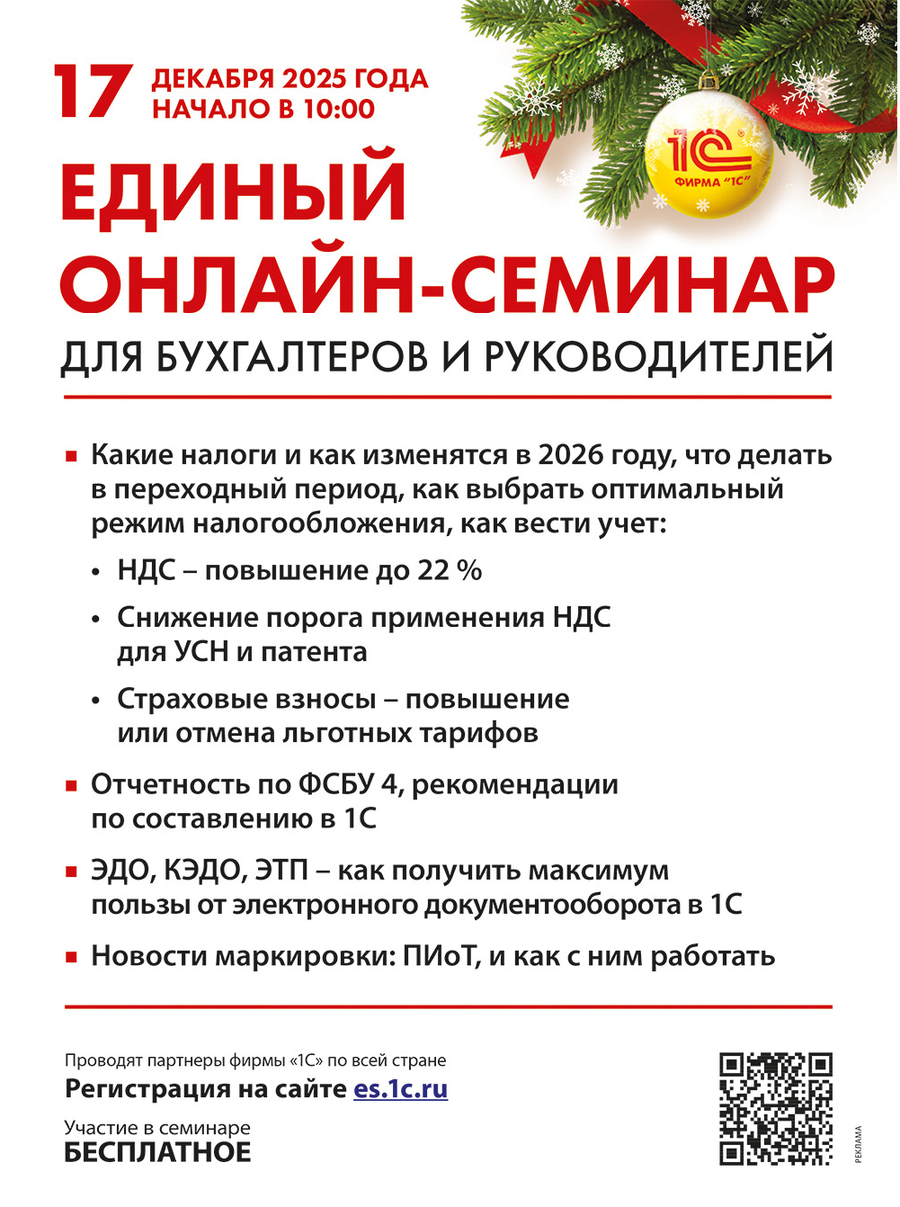 Фирма «1С» приглашает 17 декабря 2025 года в 10:00 часов по местному времени на новогодний Единый онлайн-семинар для бухгалтеров и руководителей. На семинаре выступят ведущие специалисты ФНС и фирмы «1С». Ключевые темы: