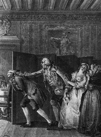 Возвращаясь в замок, она встретила Кандида и покраснела; Кандид покраснел тоже. Она поздоровалась с ним прерывающимся голосом, и смущенный Кандид ответил ей что-то, чего и сам не понял. На другой день после обеда, когда все выходили из-за стола, Кунигунда и Кандид очутились за ширмами. Кунигунда уронила платок, Кандид его поднял, она невинно пожала руку Кандида. Юноша невинно поцеловал руку молодой баронессы, но при этом с живостью, с чувством, с особенной нежностью; их губы встретились, и глаза их горели, и колени подгибались, и руки блуждали. Барон Тундер-тен-Тронк проходил мимо ширм и, уяснив себе причины и следствия, здоровым пинком вышвырнул Кандида из замка. Кунигунда упала в обморок; как только она очнулась, баронесса надавала ей пощечин; и было великое смятение в прекраснейшем и приятнейшем из всех возможных замков.