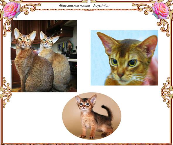 Абиссинская кошка — одна из самых древних пород кошек и одна из первых, получивших официальный выставочный стандарт. Она смело идет на руки и постоянно ластится, мгновенно располагая к себе даже самых замкнутых людей. Общение с таким животным доставляет море удовольствия. Она постоянно готова к играм и почти не устает. Игривость представители абиссинской породы сохраняют до глубокой старости. Эти кошки стремятся познавать окружающий мир. Их игривость сохраняется на протяжении всей жизни, но они уравновешенны, интеллигентны и умны, очень ласковы к членам семьи. Абиссинцы не проявляют агрессии, во время игр обычно не выпускают когти, терпеливы к детям. Кошки постоянно патрулируют свою территорию в поисках интересных занятий, любят забираться как можно выше для наблюдения. Представители породы отличаются аккуратностью и чистоплотностью, уважают установленные хозяином правила: не станут драть мебель (особенно при наличии когтеточки), кататься на шторах и сбивать горшки с цветами. Они обладают независимым характером, чувством собственного достоинства, поэтому не станут терпеть неуважительного обращения, не будут постоянно сидеть на руках. Характером они немного напоминают собак: преданны, с удовольствием играют, принося брошенные хозяином предметы. Абиссинская кошка — верный друг, который всегда будет рядом. Они не любят одиночества, поэтому рекомендуется иметь ещё какое-нибудь животное в доме, если вы подолгу отсутствуете дома.