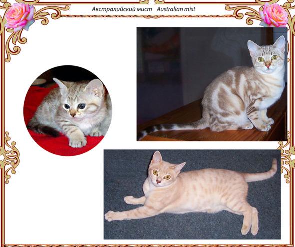 Австралийский мист — это порода дымчатых пятнистых кошек. Эту породу вывели в Австралии. С 1998 года порода официально зарегистрирована не только в пятнистом, но и в мраморном окрасе. Целью ученых было совместить в одной кошке такие черты характера, как верность, послушание и терпимость. Австралийская «дымка» является образцом идеального домашнего питомца, созданная специально для взаимодействия с людьми. Вы никогда не увидите животное в плохом расположении духа и с выпущенными когтями, что очень важно для семей с детьми. Как и все котята, детеныши мистов активные, но с возрастом озорство заменяется спокойствием и размеренностью. Верные своим хозяинам, кошки стремятся везде и всегда быть рядом с ними. Австралийцы дружелюбны не только по отношению к людям, но также хорошо уживаются с другим домашними обитателями, например, с собаками. Они проявляют незаурядные умственные способности, выносливость и умение приспосабливаться к любым условиям. Мисты хорошо поддаются дрессировке, с ними можно гулять на поводке. Австралийский мист — ласковый, но не навязчивый, достаточно самостоятельный, преданный, интеллигентный с общительным и дружелюбным характером. Они умеют
