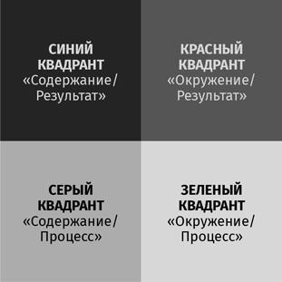 Таким образом, мы получим четыре квадранта, которые я условно обозначу цветом согласно своим собственным ассоциациям. Чуть позже мы рассмотрим особенности каждого типажа в отдельности. Прежде чем перейти к характеристике каждого из четырех квадрантов, обозначим, что мы подразумеваем под двумя указанными выше метапрограммами.