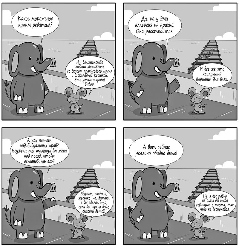 Если рассматривать утилитаризм исключительно с рациональной точки зрения, он может показаться очень даже привлекательной концепцией философии морали. Но, к сожалению, утилитарный подход не берет в расчет базовые человеческие права или понятие справедливости. Если довести ситуацию до крайности, опора на логику утилитаризма может привести к неправильным (и даже аморальным [9]) решениям. Именно поэтому современные философы объединяют принципы утилитаризма и фундаментальную веру в необходимость соблюдения прав человека. Например, Джон Ролз предложил концепцию утилитаризма, при которой действие считается морально оправданным только в том случае, если оно принесло максимальную пользу, а также привело к улучшению положения всех тех, кого затронуло.