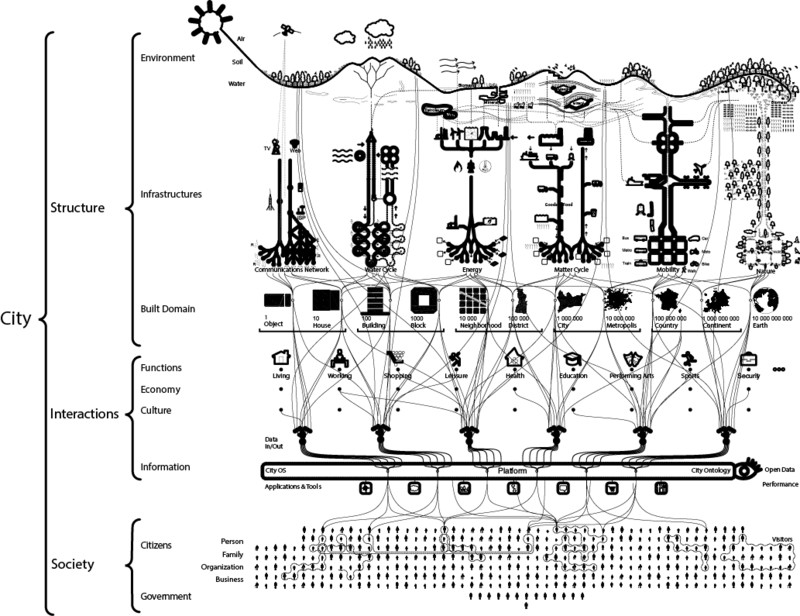 Сеть состоит из узлов, связей между этими узлами и обмена информацией внутри сети в определенной среде. Узлы, соединения, информация и среда — исходя из этого определения, мы можем представить анатомию любого города, независимо от стадии его развития или страны, в которой он находится. Можно сказать, что такой взгляд на анатомию города пытается примирить урбанистическую науку с экологической, условно — объединить видения Ильдефонса Серда и Рамона Маргалефа. Вывод, к которому мы пришли, заключается в том, что город формируется из его физической структуры, из людей, этот город создающих и в нем проживающих, из информации, поступающей в него и, наконец, из связей, которые в нем образуются.